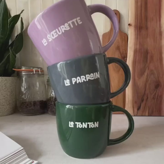 Un mug en faïence fabriqué en Europe, coloré puis sérigraphié en blanc au nom du Tonton.